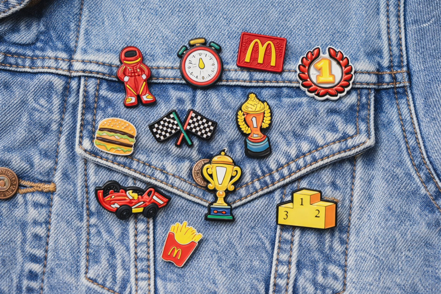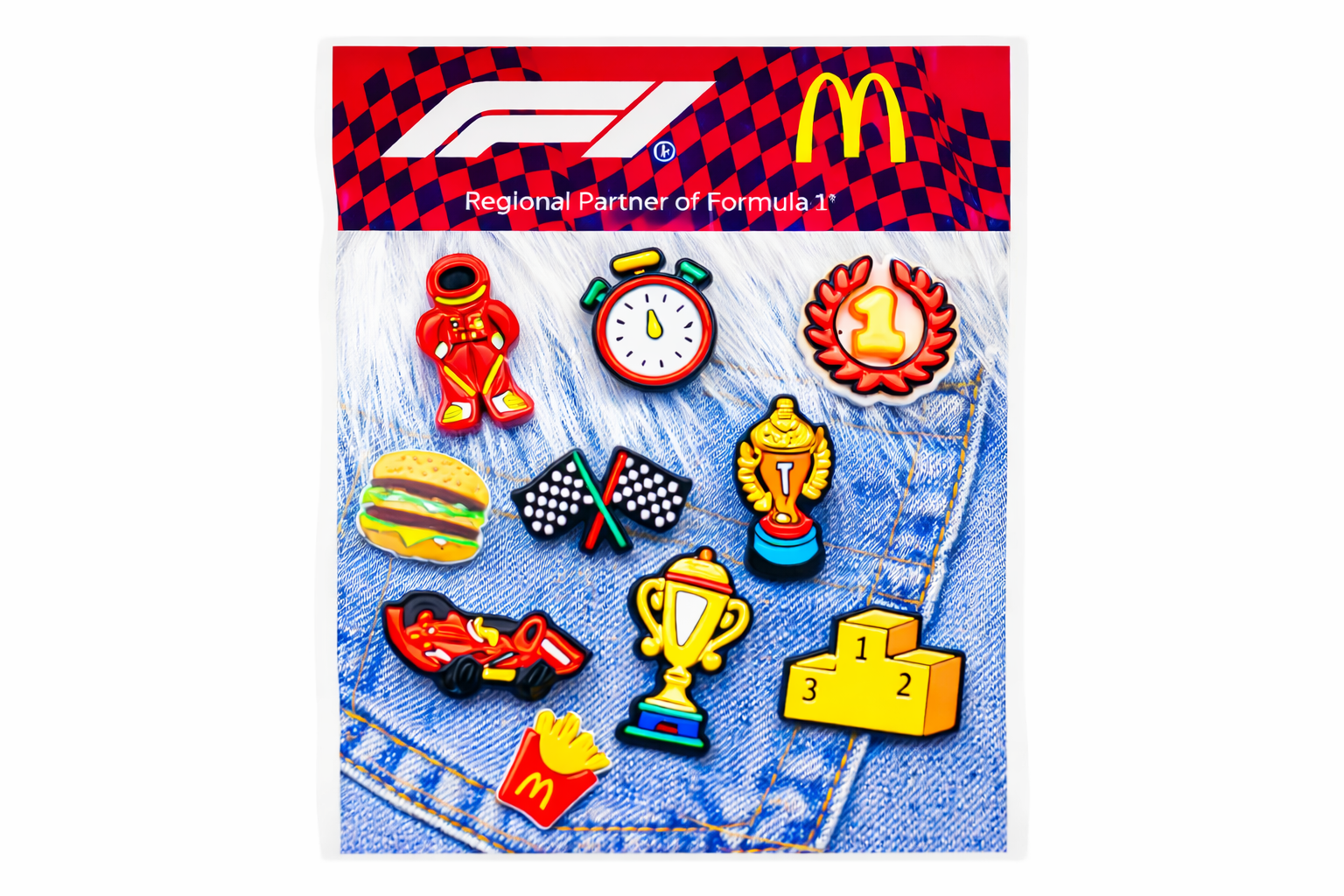 Set de pines fabricados en silicona, con un tamaño estimado de 5 x 3 cm por modelo, diseñados en colores vibrantes con motivos inspirados en la Fórmula 1. El set incluye 10 pines diferentes, ideales para coleccionar, personalizar prendas o accesorios, y perfectos como artículo promocional con un estilo dinámico y deportivo.