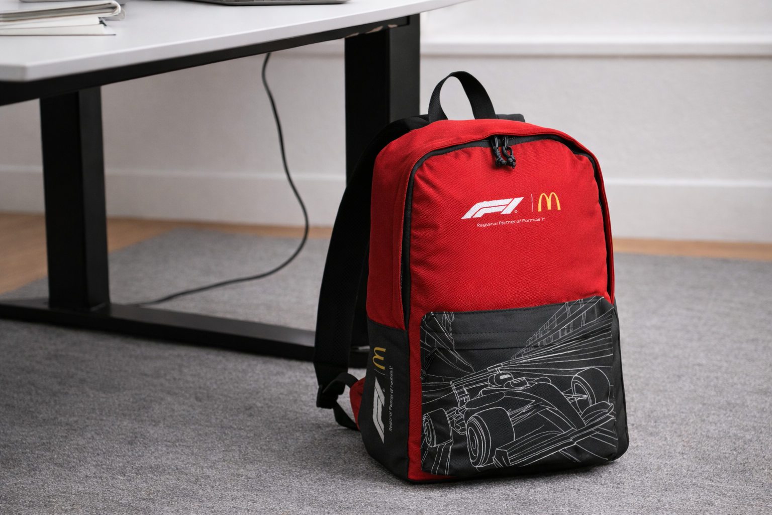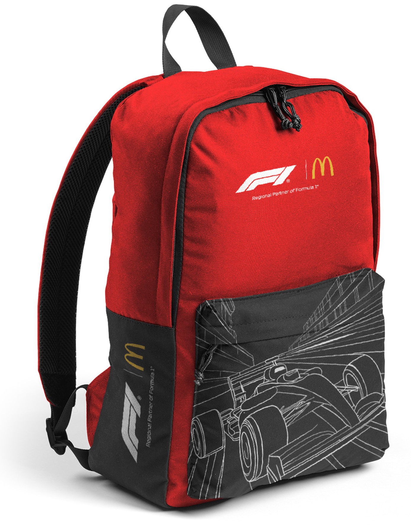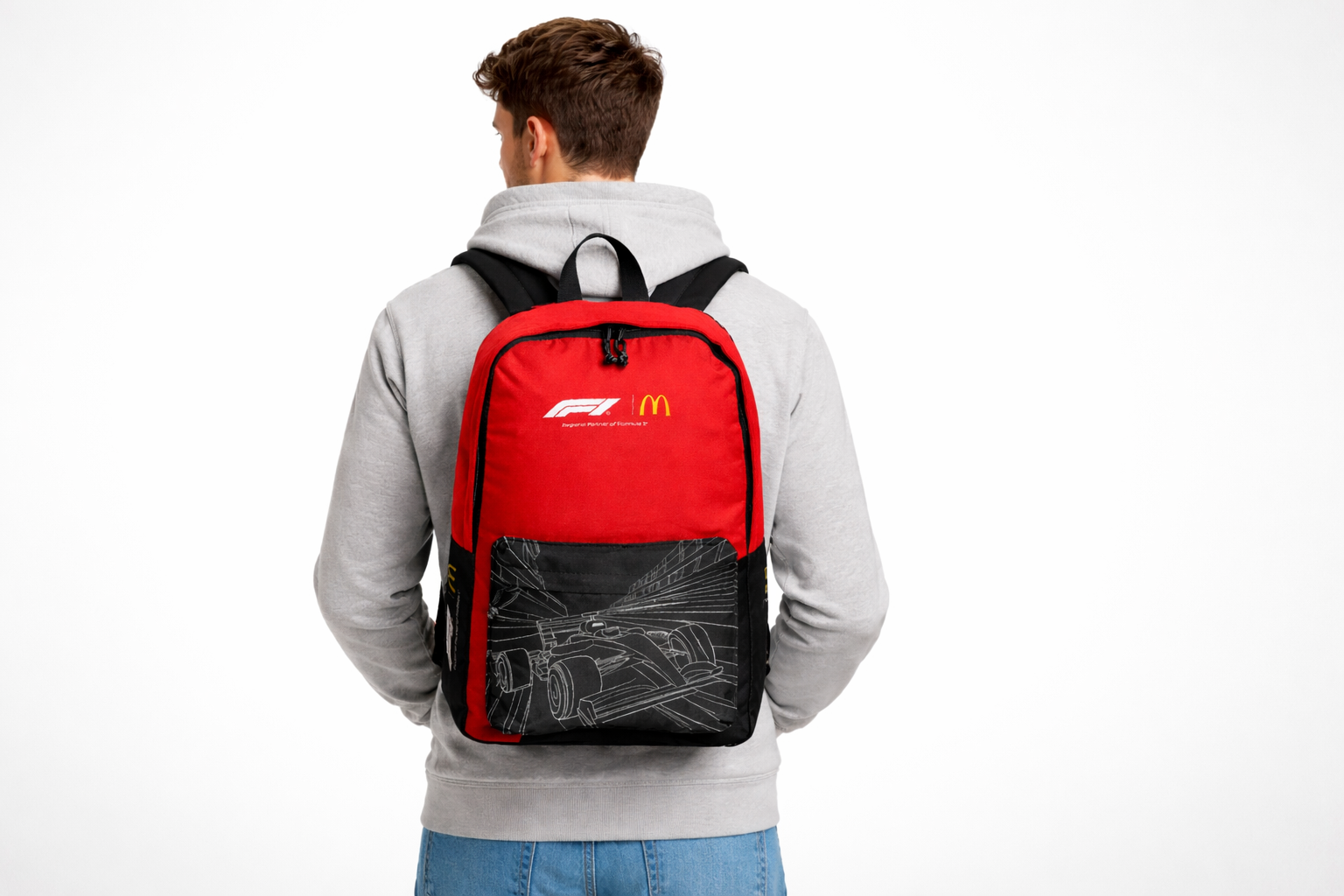 Mochila fabricada en tela Oxford 600D, resistente y duradera, con un tamaño de 46 x 32 x 16 cm ideal para el uso diario o viajes cortos. Presenta diseño en color rojo y negro con logotipo de Fórmula 1, combinando funcionalidad y un estilo deportivo y moderno.