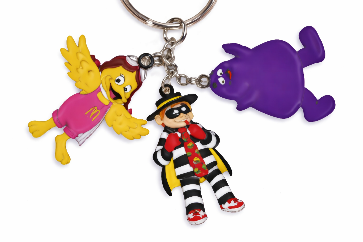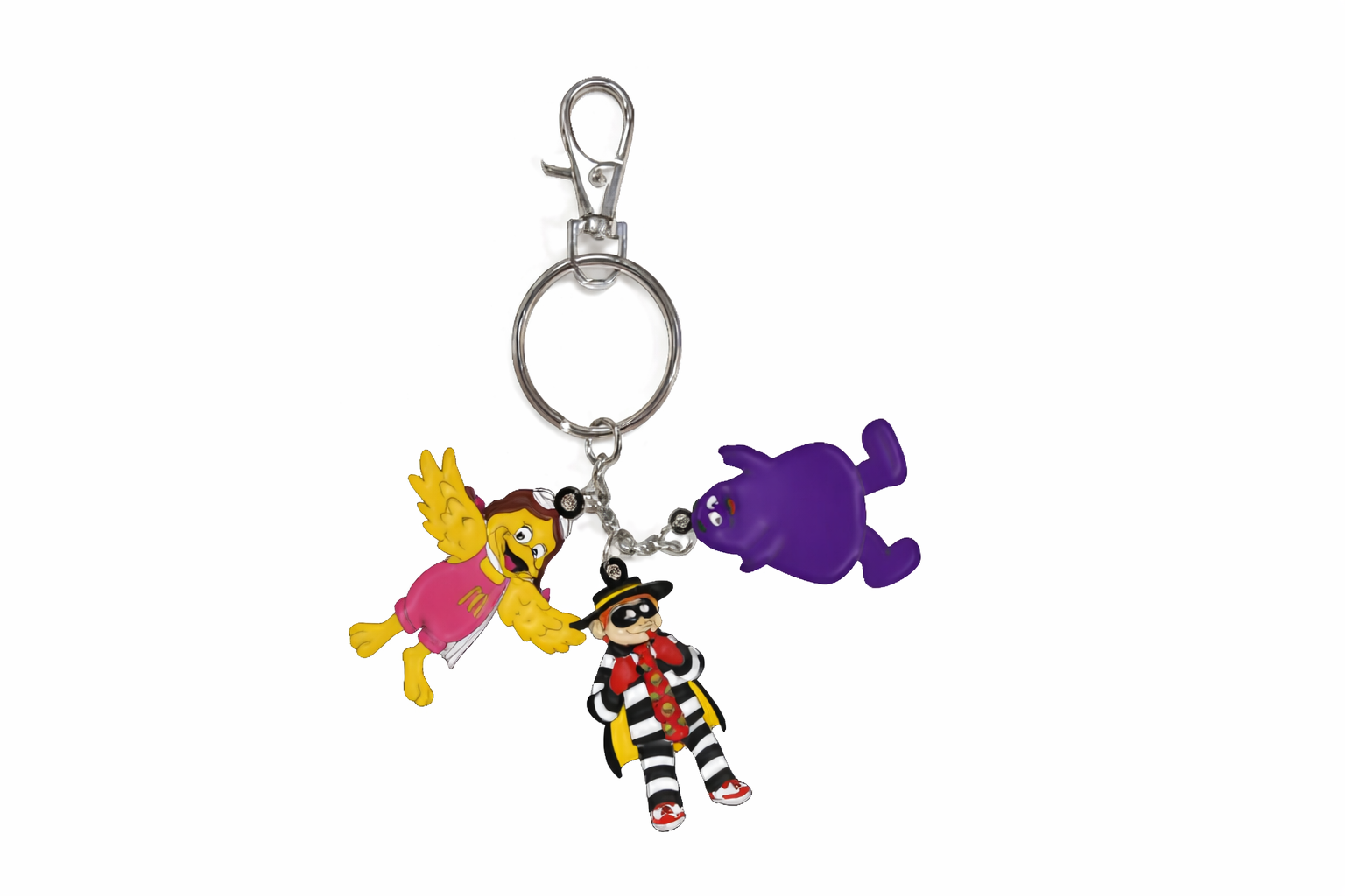 Llavero metálico con tres diseños distintos de personajes de McDonald’s, fabricado en aleación de zinc para mayor durabilidad y buen acabado. Cada pieza tiene un tamaño aproximado de 4 x 5 cm e incorpora un anillo metálico de 3 cm, ideal para llevar llaves, colgar en mochilas o usar como accesorio decorativo. Un set práctico y coleccionable que combina resistencia y estilo con un toque icónico.
