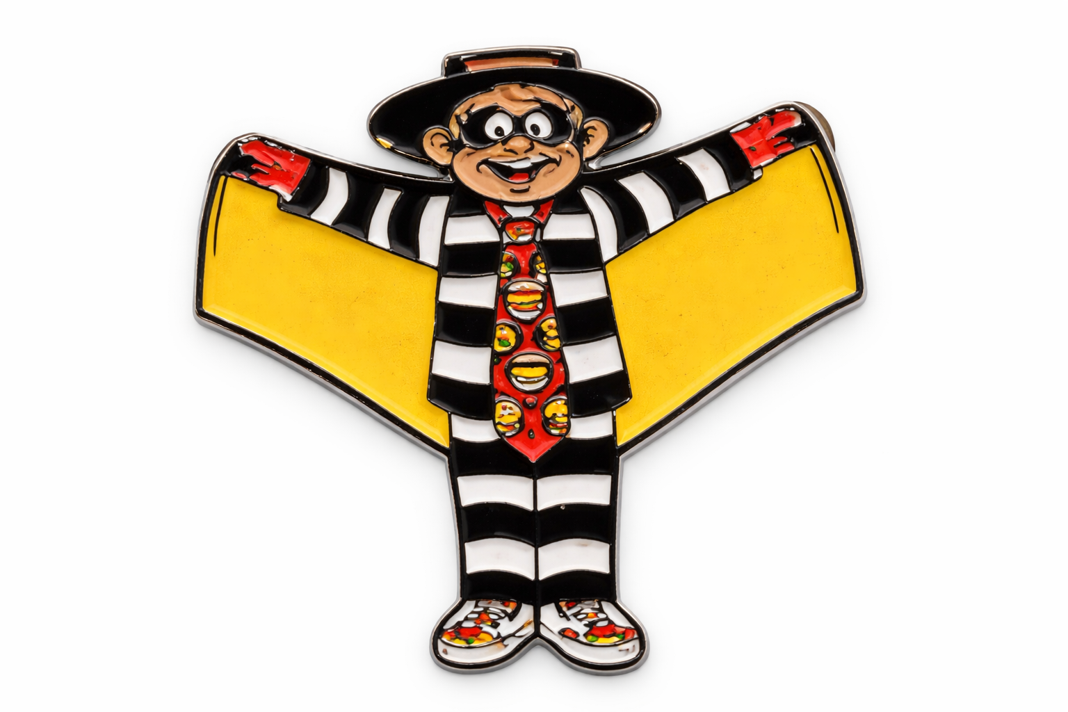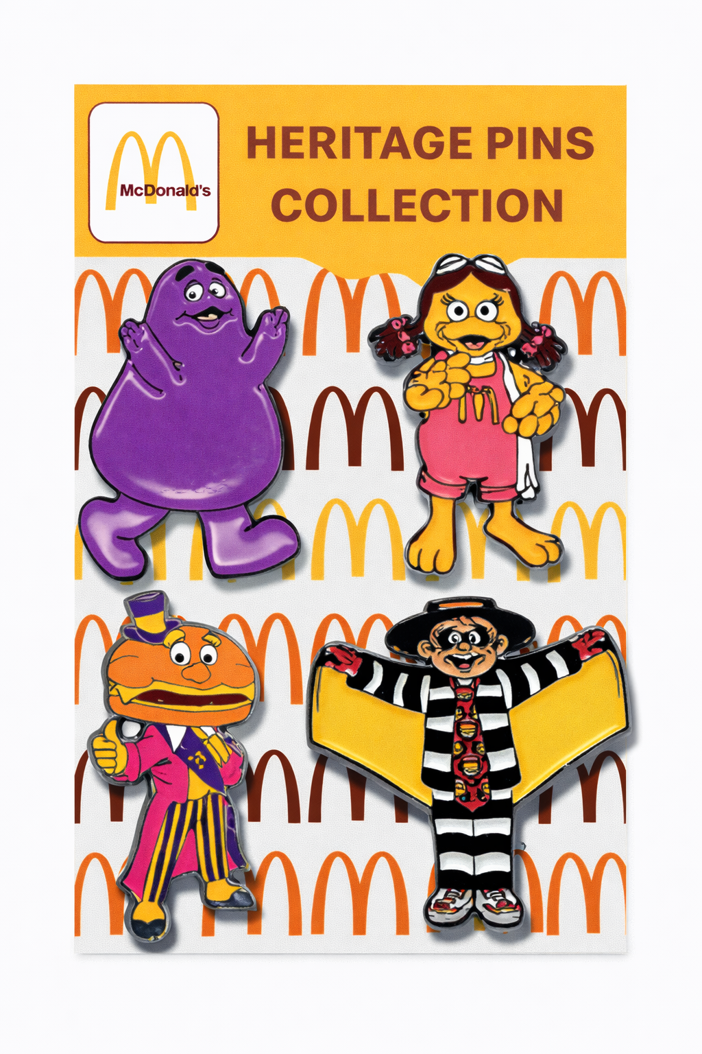 Juego de 4 pines metálicos inspirado en personajes de McDonald’s, ideal para coleccionistas y fans de la marca. Fabricados en metal con acabado resistente y colores vivos, incluyen cuatro diseños distintos que aportan un toque divertido y retro a mochilas, chaquetas o gorras. Un set compacto y decorativo perfecto para personalizar accesorios o completar una colección temática.