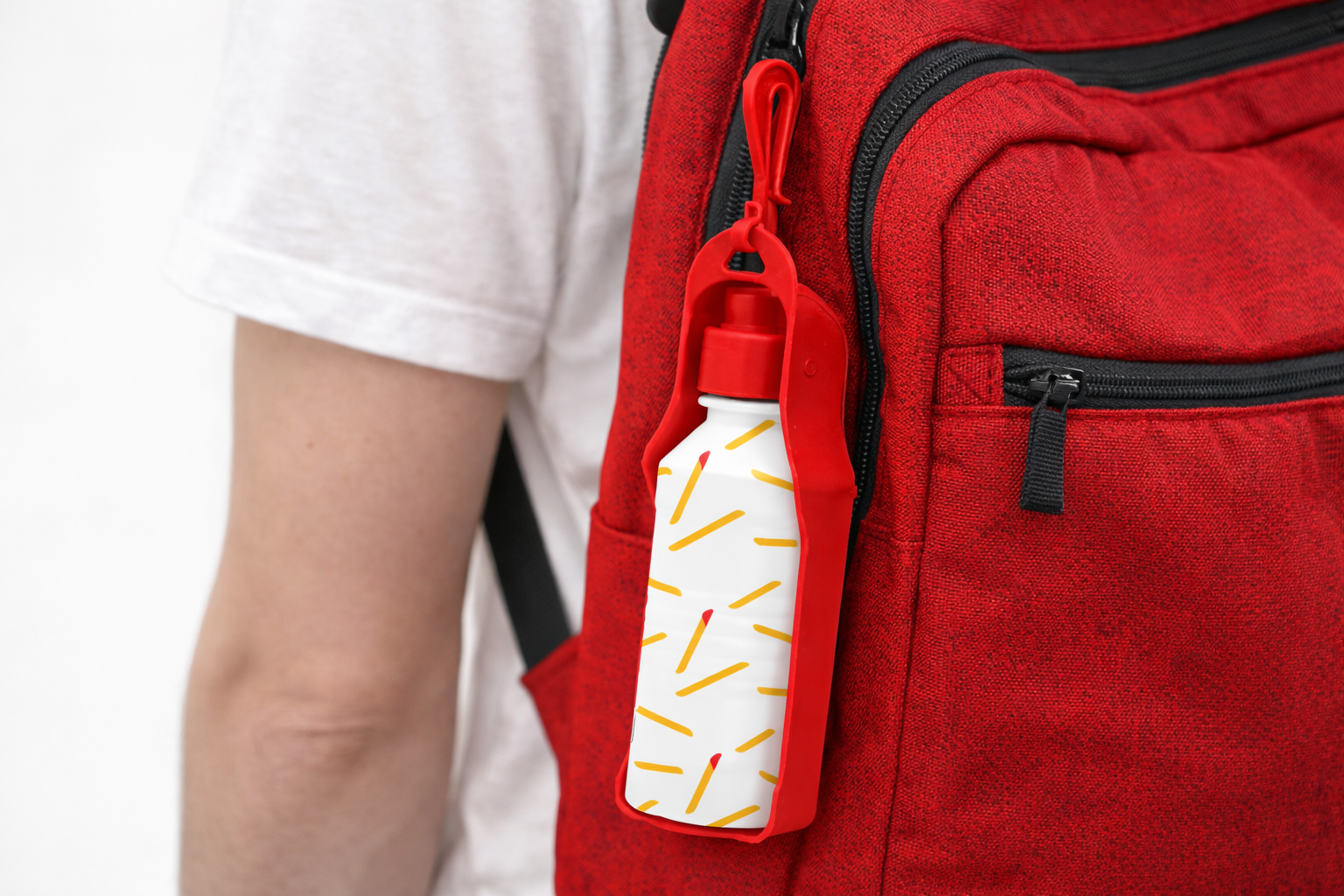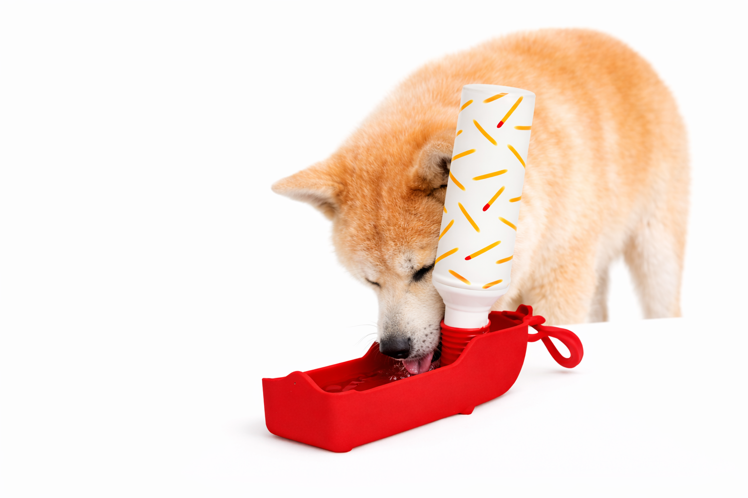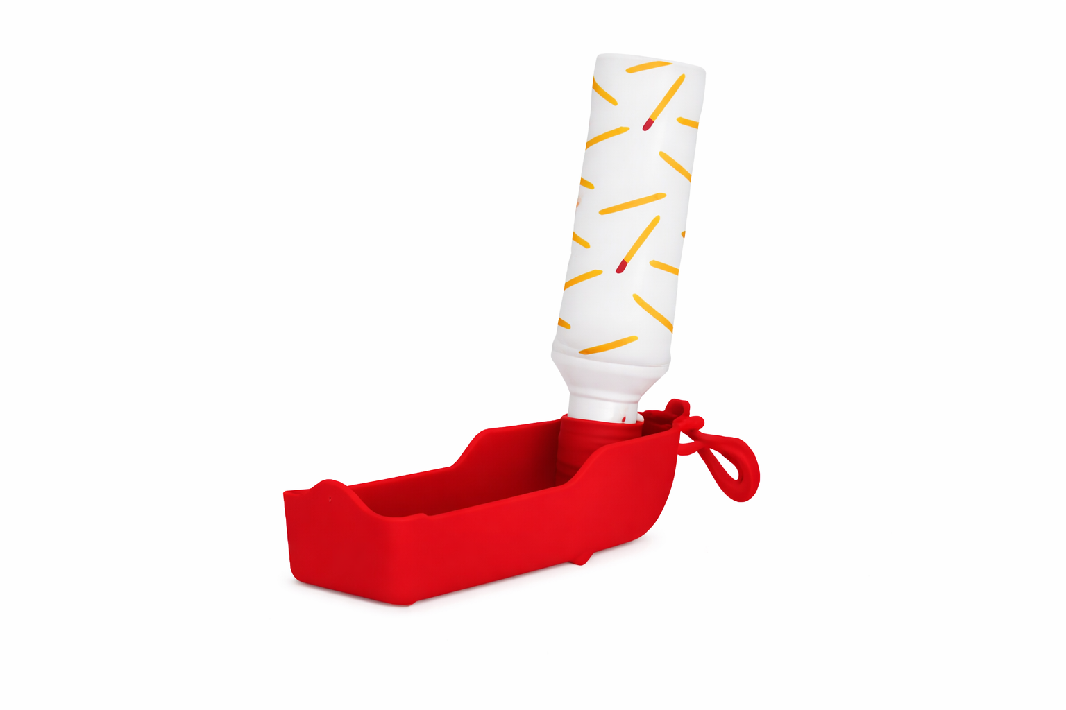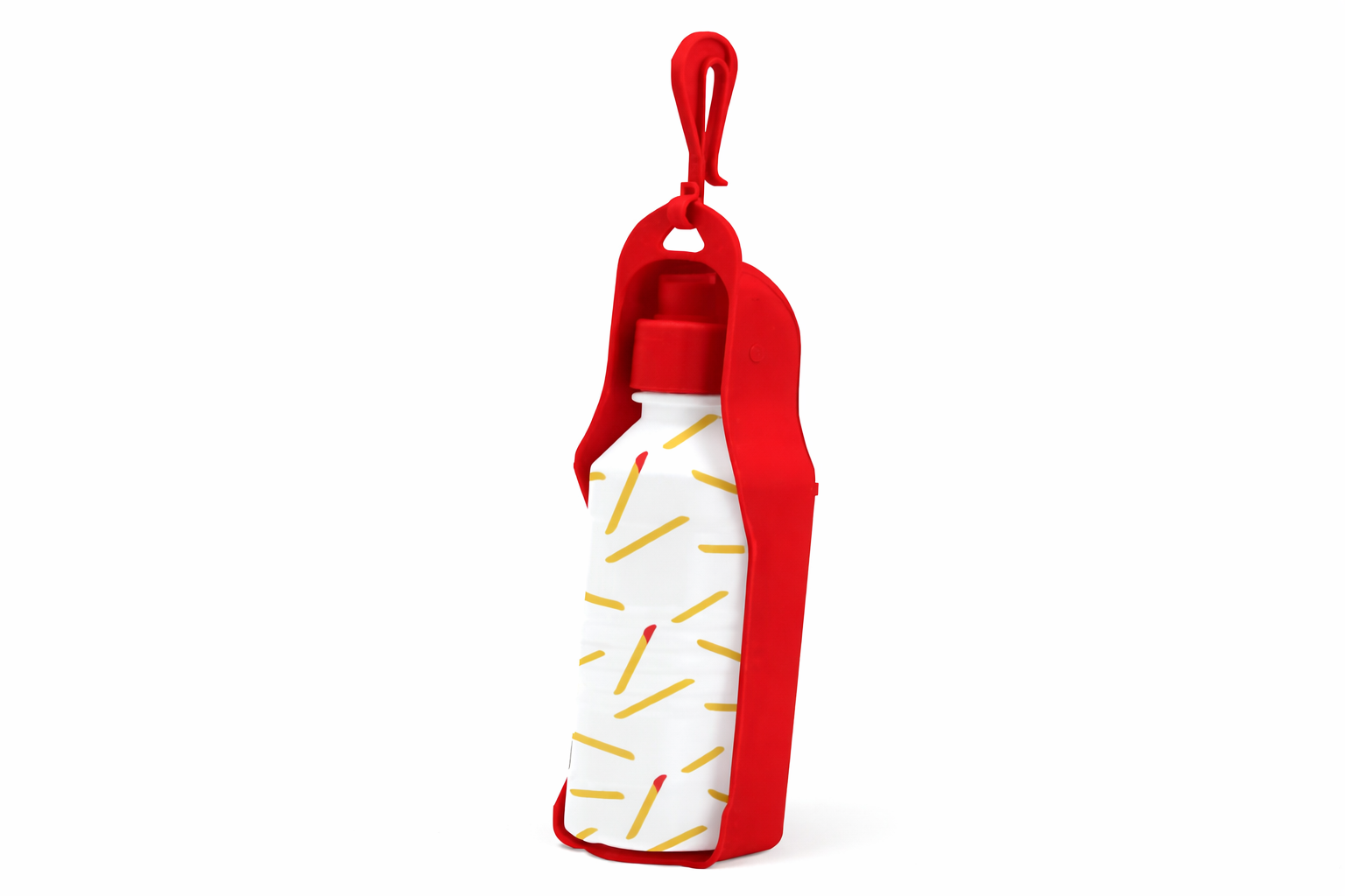 Botella de agua para mascotas práctica y ligera de 250 ml, ideal para paseos, viajes y actividades al aire libre. Presenta un diseño en color blanco y rojo con estampado de patatas fritas, fabricada en plástico resistente y pensada para un uso cómodo en cualquier momento. Incorpora función retráctil, que permite dispensar el agua fácilmente y evitar desperdicios, y cuenta con un mosquetón de plástico para colgarla de la correa, mochila o bolso, facilitando su transporte y acceso rápido. Perfecta para mantener a tu mascota hidratada estés donde estés.