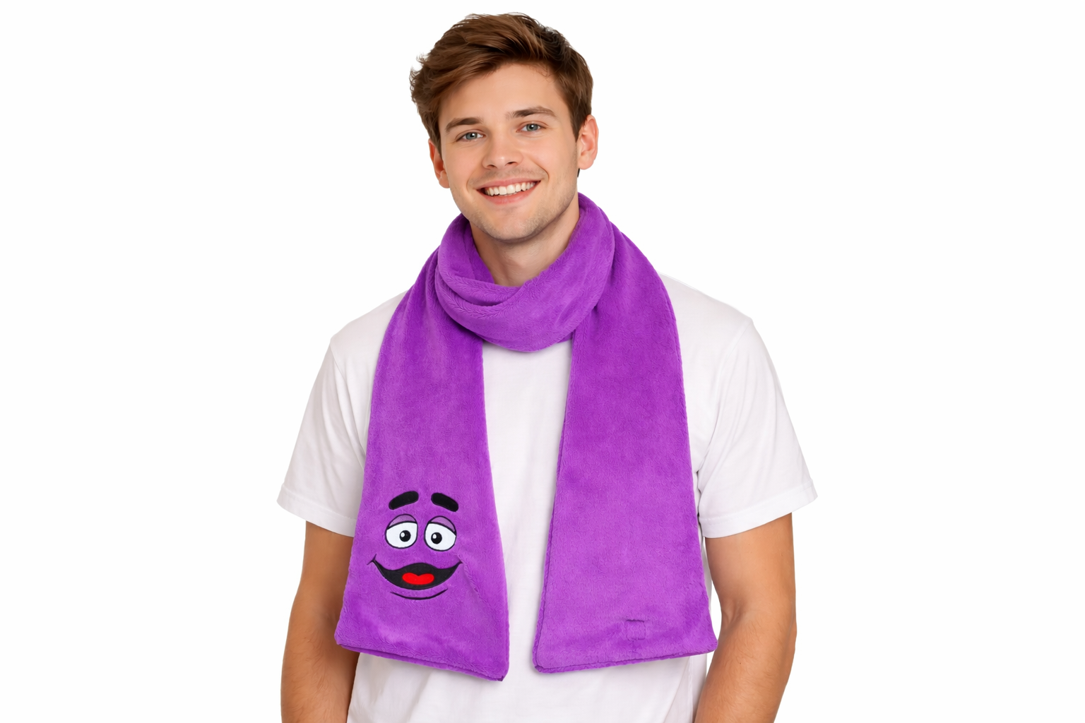 Mantente abrigado y con estilo con esta bufanda de Grimace, el accesorio perfecto para los fans de McDonald’s que buscan comodidad y un toque divertido en su look. Confeccionada en una suave mezcla de 50 % poliéster y 50 % acrílico, cuenta con un diseño de doble capa que aporta mayor calidez y un acabado limpio sin flecos finales, mide 200 × 25 cm y tiene un peso aproximado de 269 g, ideal para usar a diario en los meses más fríos.