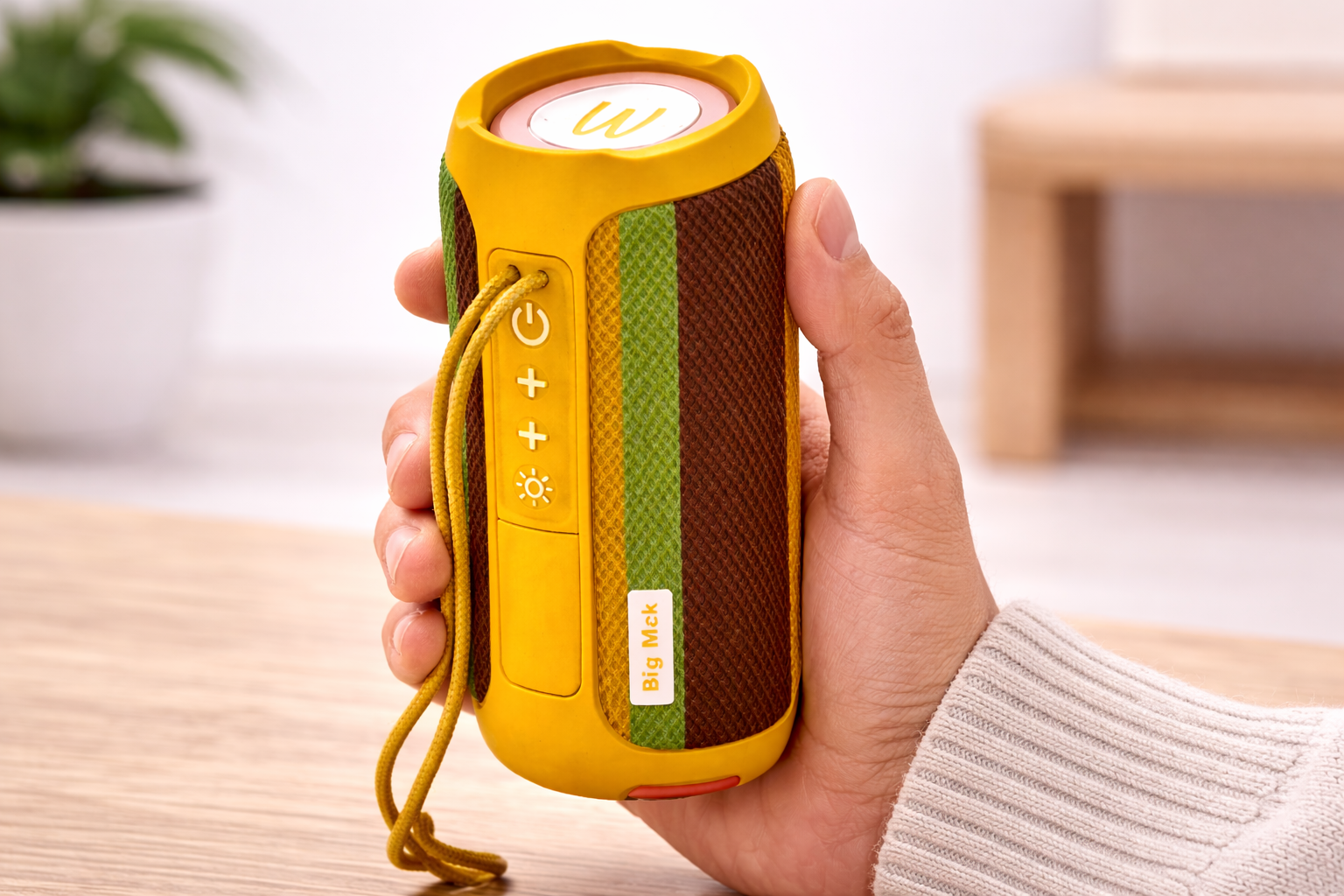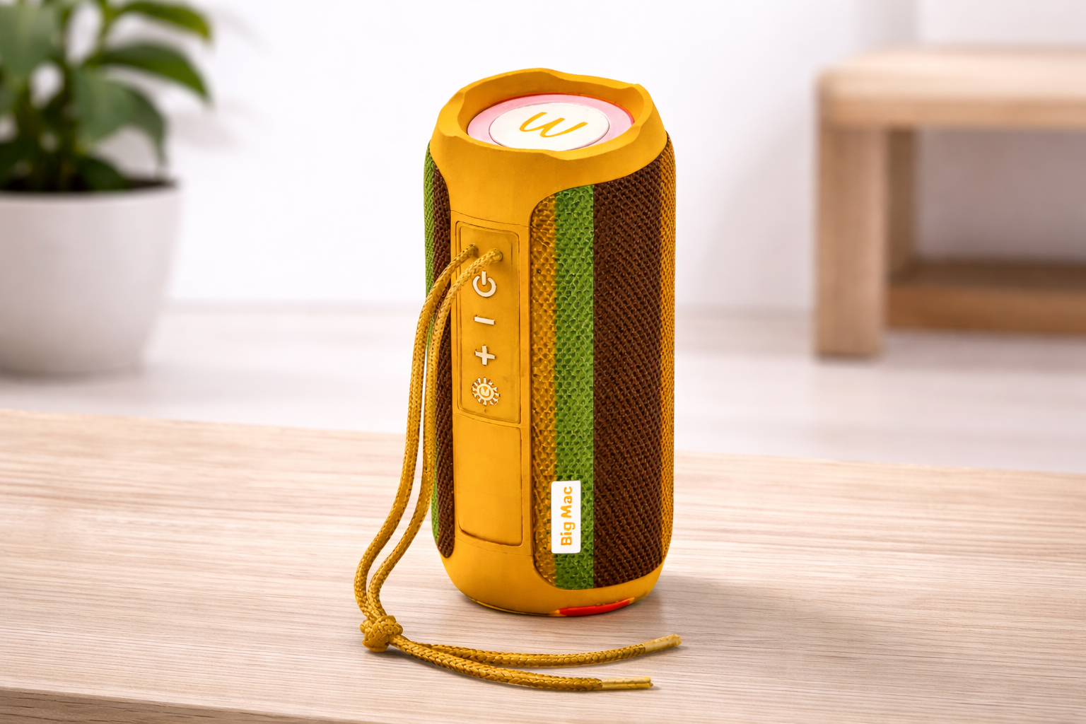 Altavoz portátil diseñado para ofrecer un sonido potente y equilibrado en un formato compacto, con una respuesta de frecuencia de 100 Hz a 20 kHz que garantiza una reproducción clara tanto de graves como de agudos. Incorpora dos altavoces de 52 mm con una potencia de 40/5 W por unidad y funciona con un voltaje de 3,7 V, proporcionando una autonomía de uso de entre 2 y 4 horas gracias a su batería de 1200 mAh. Dispone de botones integrados para controlar la reproducción, incluyendo pausa, siguiente y ajuste de volumen, lo que facilita un manejo cómodo e intuitivo. Se carga mediante entrada de 5V/500 mA y presenta un tamaño de 6,84 x 6,84 x 16,15 cm con un peso de 350 gramos, ideal para transportarlo fácilmente. Fabricado en plástico con acabado a pantone e impresión irregular, combina funcionalidad y diseño para un uso diario práctico y versátil.