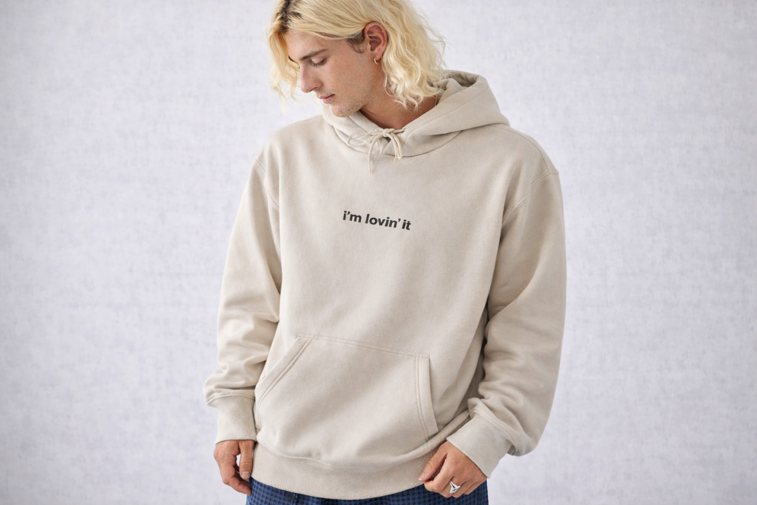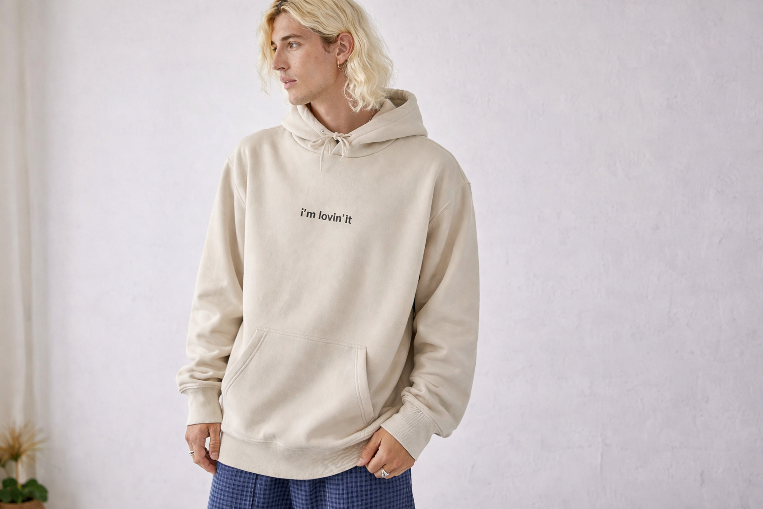 Eleva tu estilo casual con esta Ideal Hoodie, confeccionada con una mezcla de tela premium de 350gsm compuesta por 40% algodón, que ofrece el equilibrio perfecto entre suavidad, durabilidad y comodidad. Diseñada en un tono beige neutro, presenta un bordado minimalista de “i’m lovin’ it” en el pecho, un amplio bolsillo canguro frontal y una capucha ajustable con cordón para mayor practicidad en el día a día. Su corte relajado y su confección de peso pesado la hacen ideal para superponer en días más frescos, mientras que su diseño limpio garantiza versatilidad: perfecta tanto para los entusiastas del streetwear como para quienes valoran la comodidad y el estilo discreto.