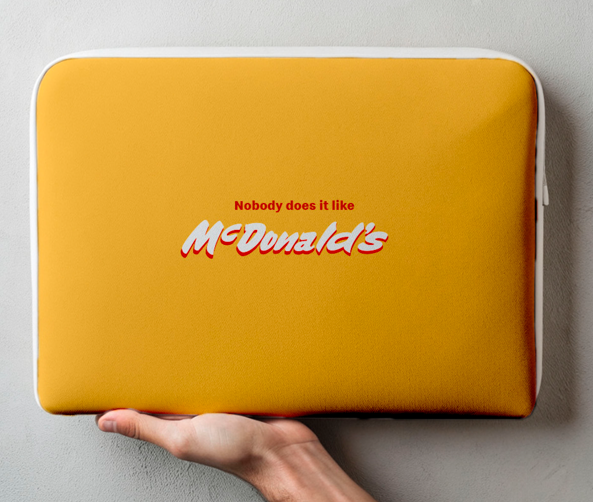 Funda protectora para laptop de color amarillo con el logotipo de McDonald's y la frase "Nobody does it like McDonald's", ideal para mantener tu equipo seguro con estilo.