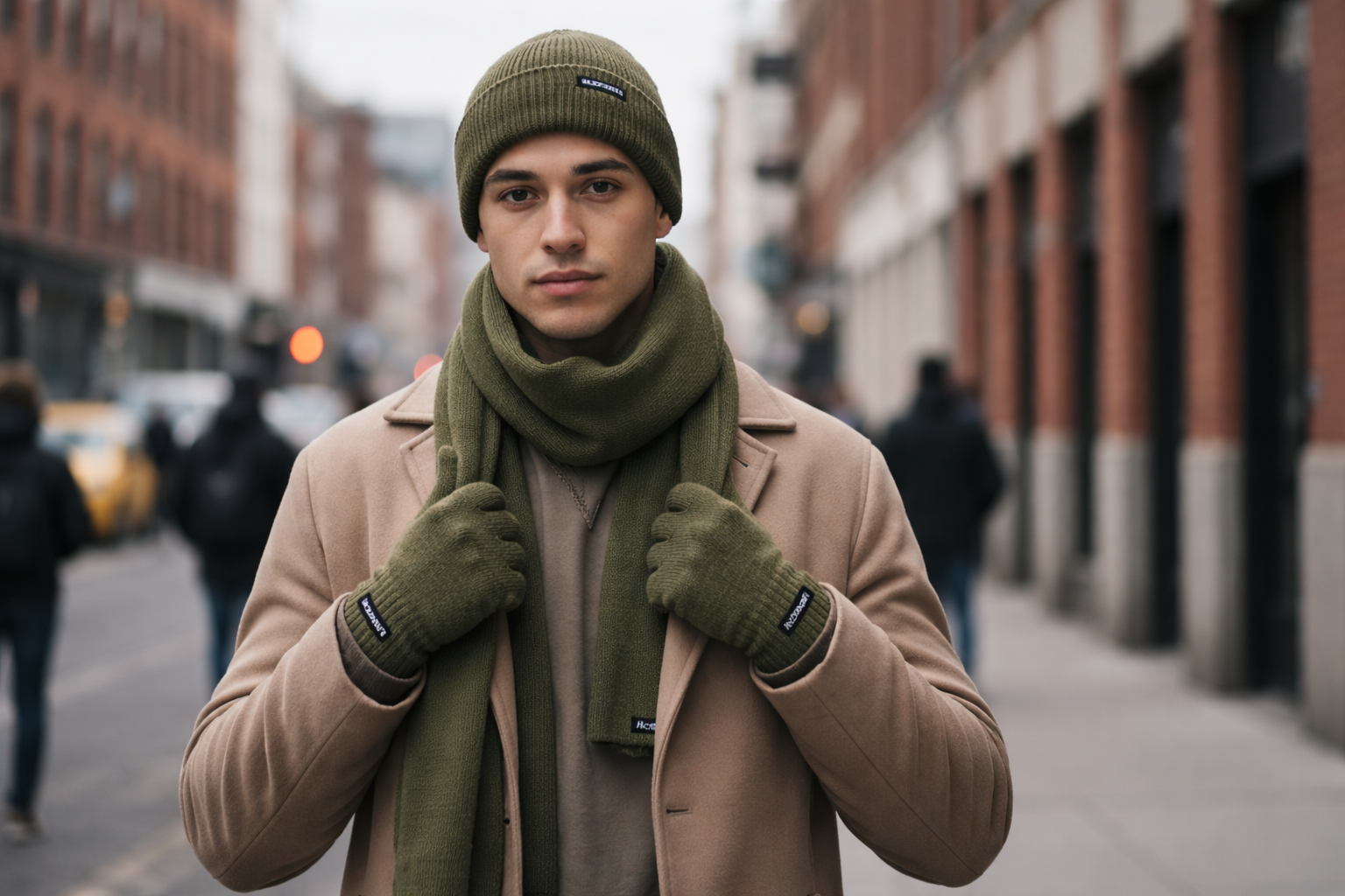Set de invierno compuesto por gorro, bufanda y guantes, confeccionados en 100 % acrílico para mayor abrigo y comodidad. Presentado en envoltorio de papel e incorpora logotipo en parche para una imagen cuidada. Una opción práctica y atractiva en color verde militar, ideal como producto promocional para temporadas de frío.