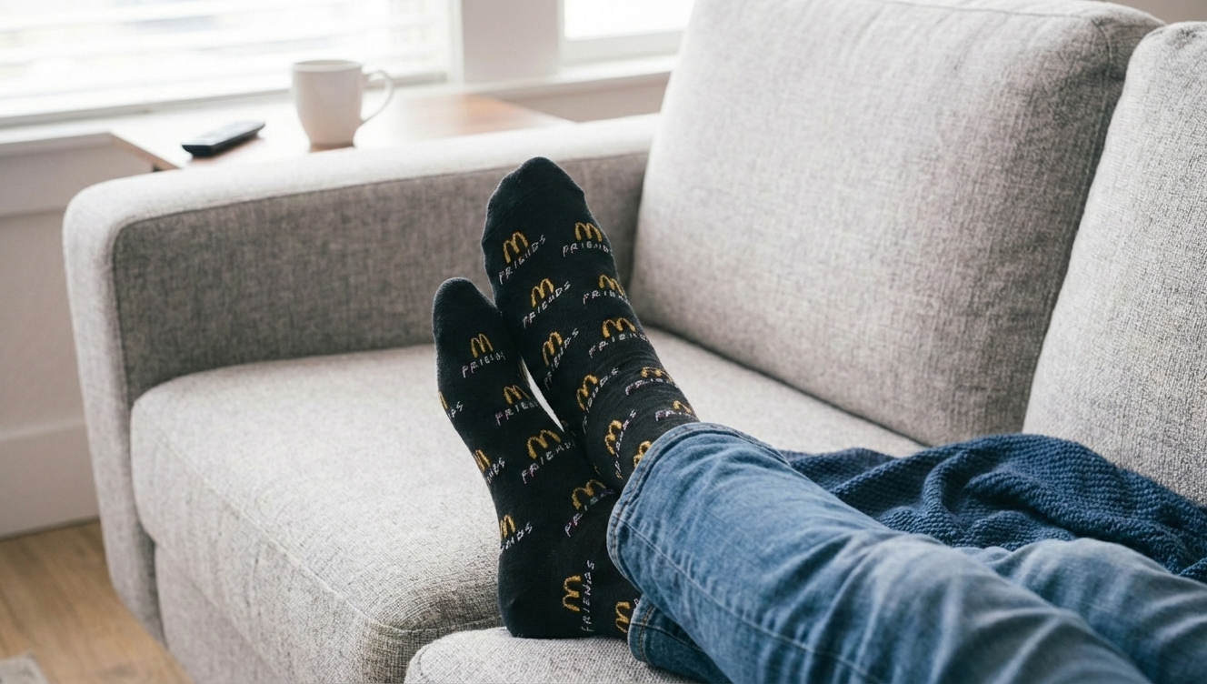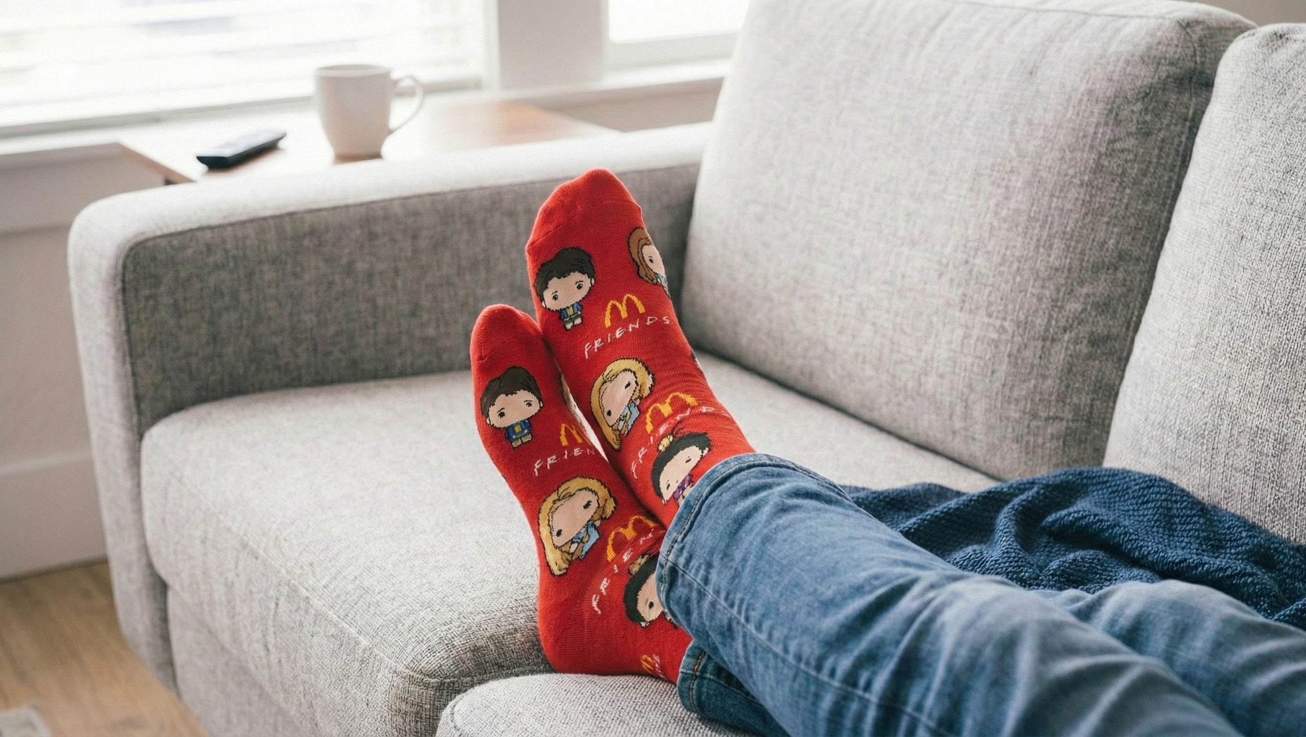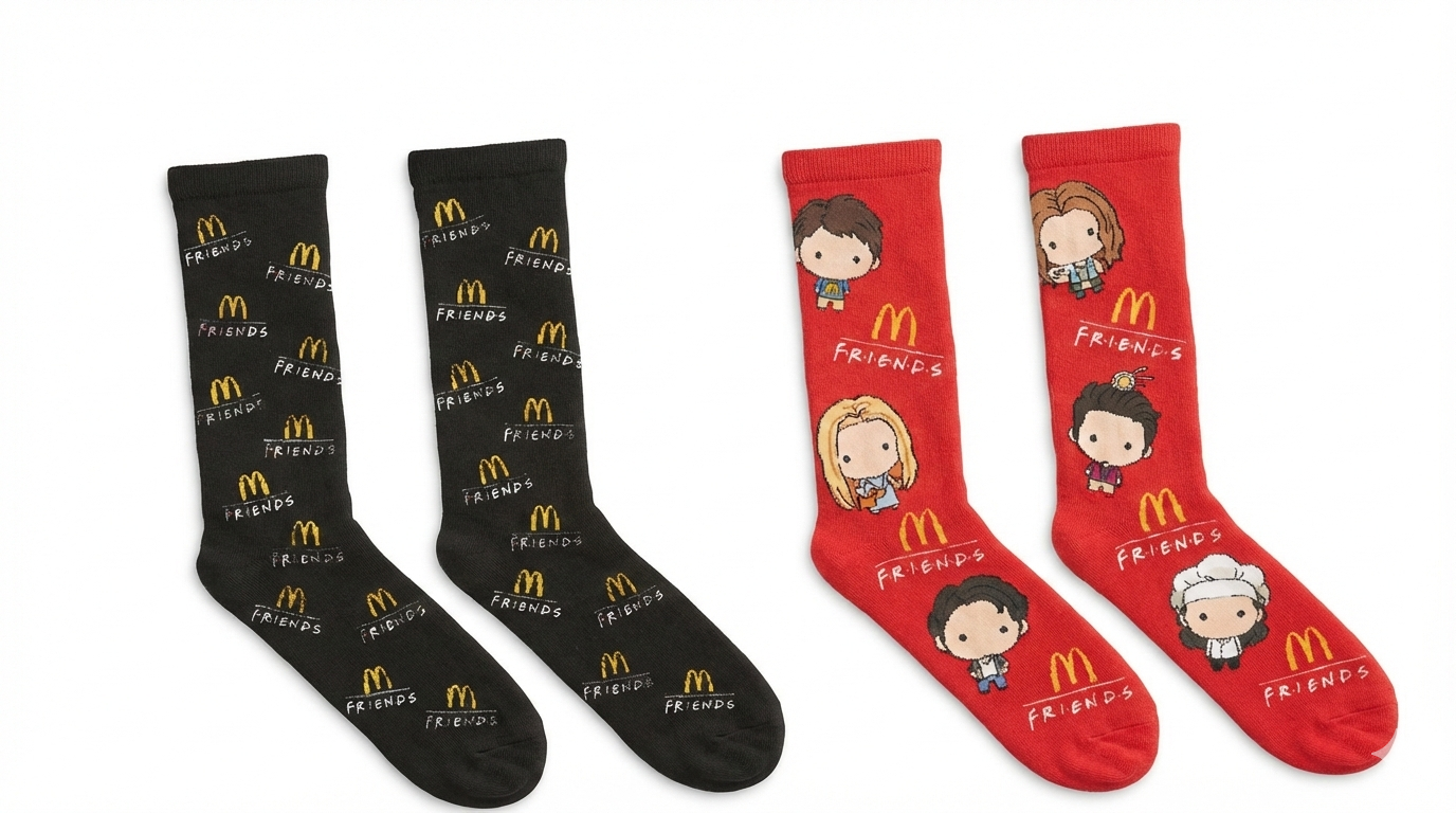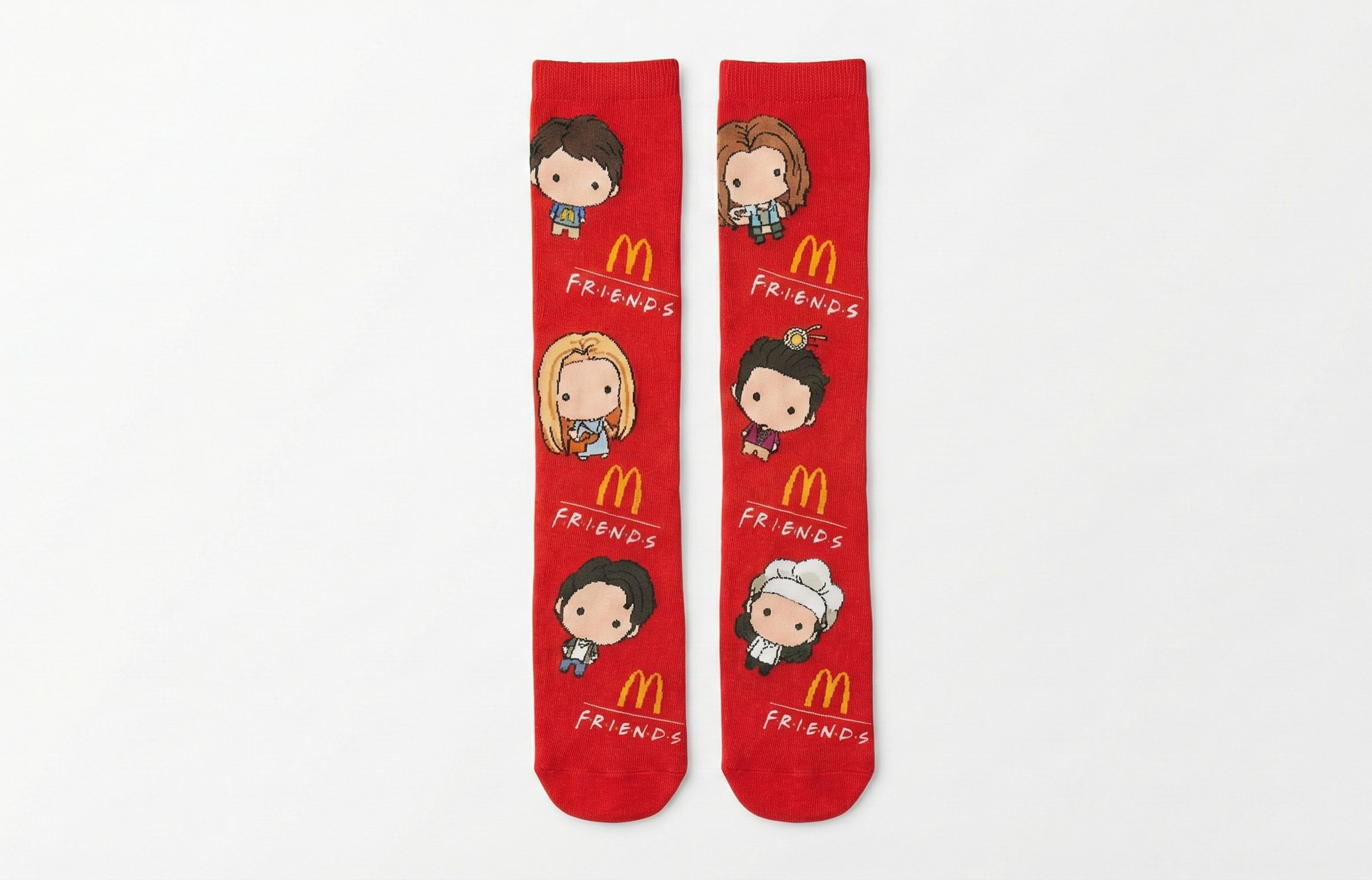 Estos calcetines presentan un diseño inspirado en la serie Friends, disponibles en color negro o rojo con ilustraciones de los personajes. Están confeccionados en una mezcla de 65% algodón, 32% poliéster y 3% elastano, ofreciendo comodidad, suavidad y un buen ajuste. La talla es 39-42 y el gramaje es de 42 a 45 g por par, lo que los hace ligeros y confortables para el uso diario. Se presentan en un packaging individual de 1 par por polybag, ideal para venta minorista o como artículo promocional.