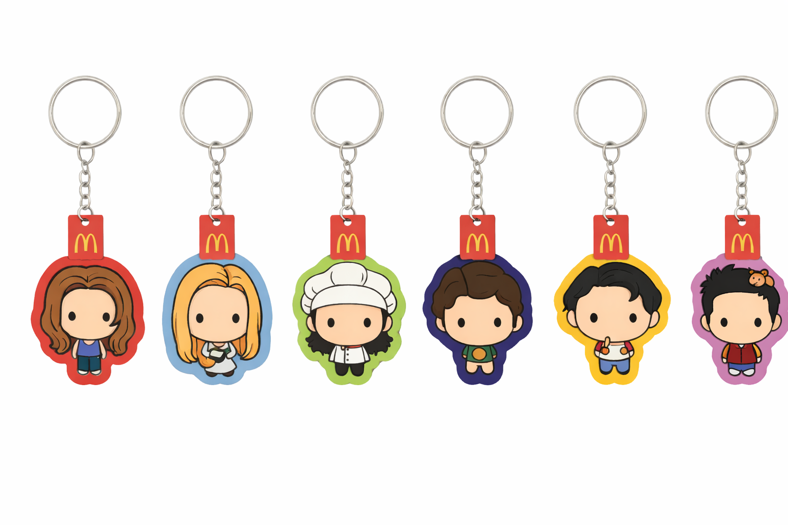 El llavero está fabricado en PVC resistente con anilla de metal, ideal para un uso diario. Presenta un diseño inspirado en la serie Friends y está disponible en 6 personajes diferentes. Tiene un tamaño aproximado de 6 cm, lo que lo hace práctico y ligero para llevar en llaves, mochilas o bolsos. Se presenta con un packaging individual, con 1 unidad por bolsa de polietileno (polybag), adecuado para venta minorista o como artículo promocional.