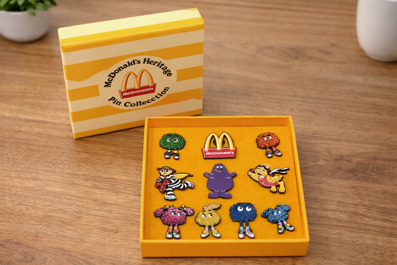 Set de imanes esmaltados de edición limitada con personajes clásicos de McDonaldland: Grimace, Hamburglar, Birdie, Fry Kids y el icónico logotipo de Golden Arches. Viene en una caja de regalo coleccionable. ¡Perfecto para los fans de McDonald's y coleccionistas de imanes!