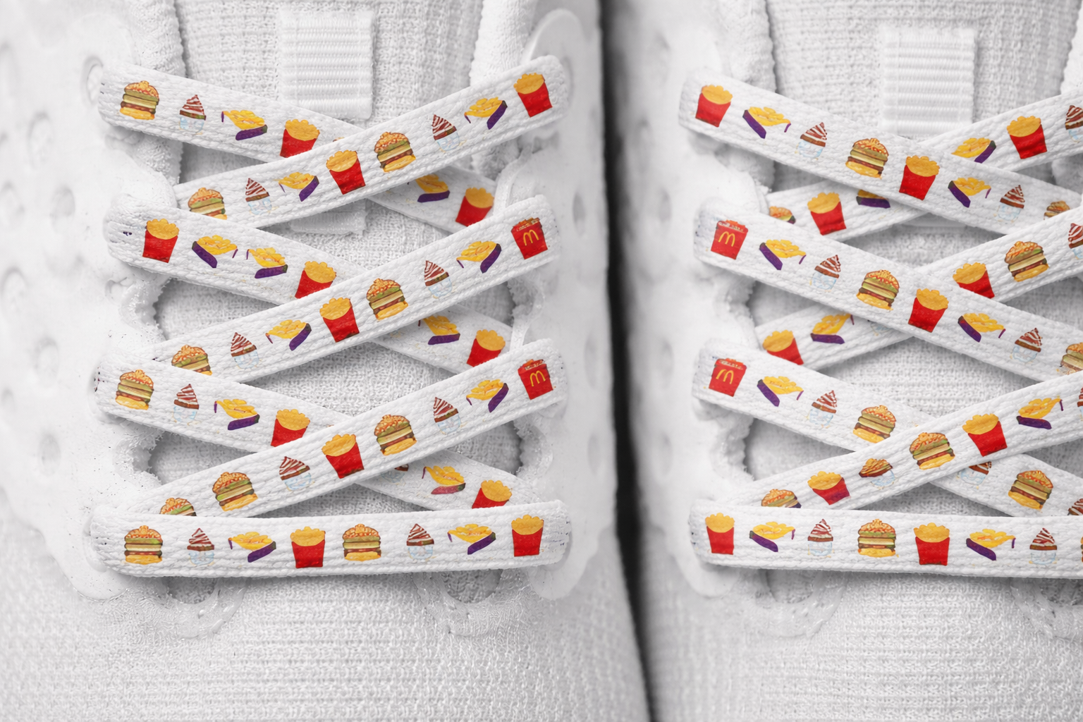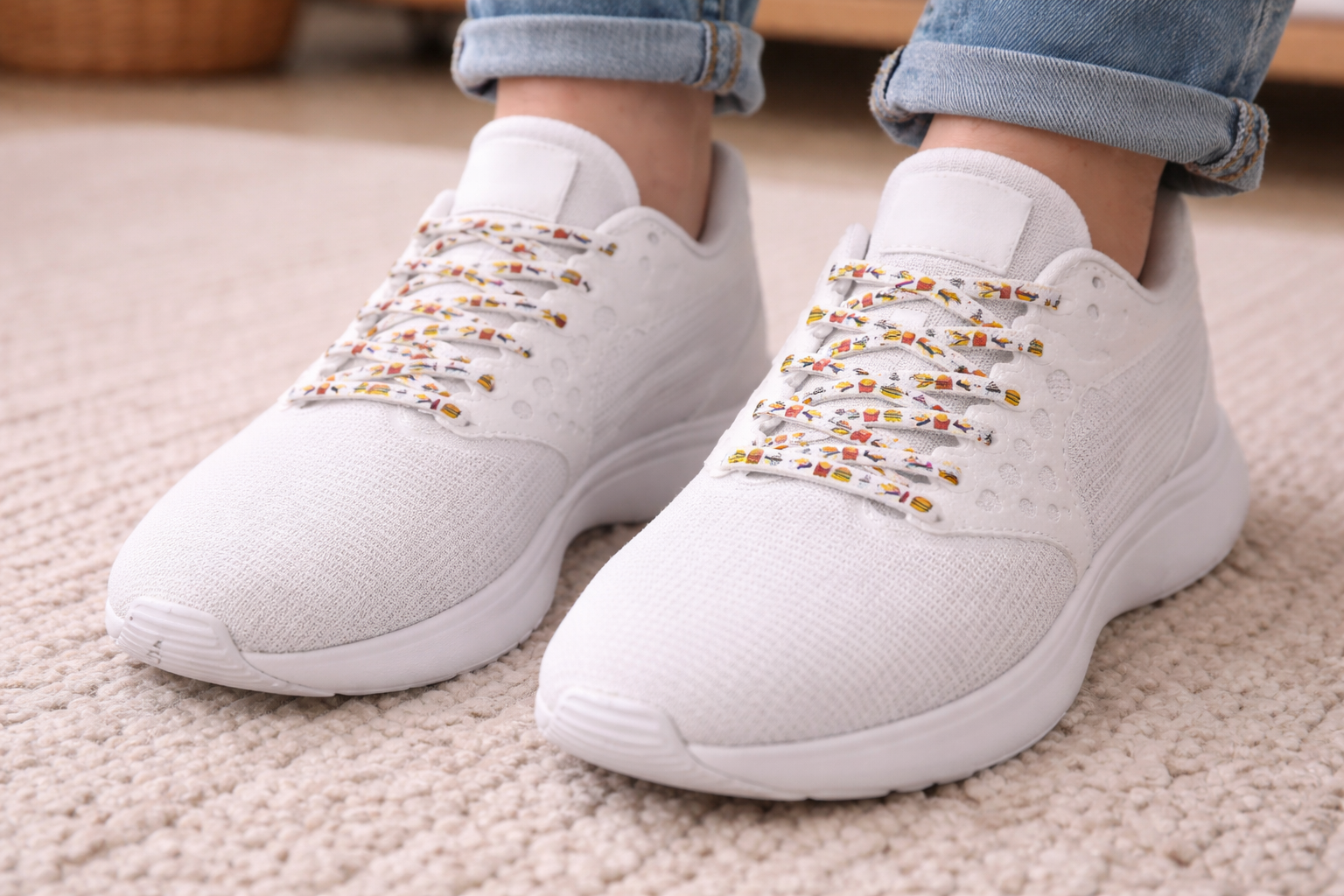 Cordones para zapatos con divertido diseño de hamburguesas y patatas fritas, ideales para dar un toque original a cualquier calzado. Fabricados en poliéster resistente, y con unas medidas de 120 x 0,8 cm, compatibles con la mayoría de zapatos.